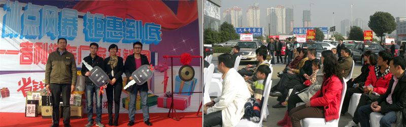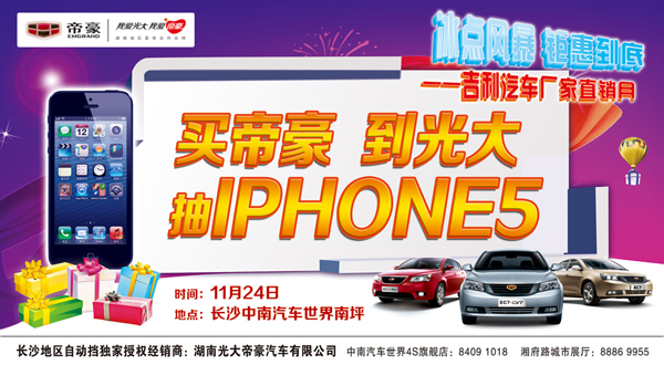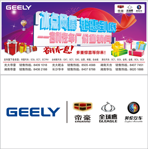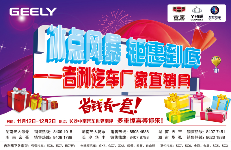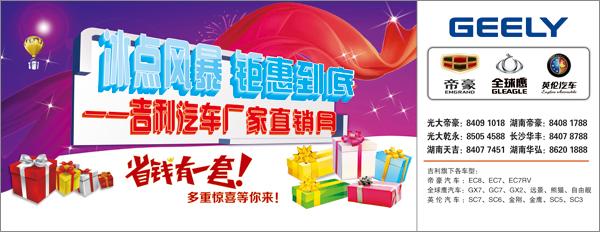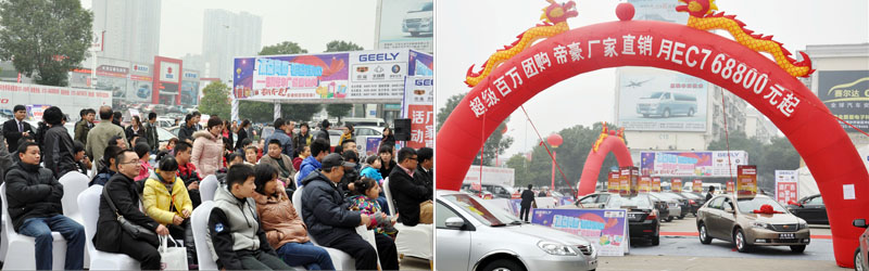 【活动介绍】:史无前例的吉利汽车长沙厂家直销月是由我们湖南慧网文化传播有限公司全权执行,活动时间为2012年11月12日-12日2日,吉利汽车携旗下帝豪品牌、全球鹰品牌和英伦品牌三大子品牌,长沙6家4S店隆重亮相长沙中南汽车世界新车展厅南广场。本次吉利汽车厂家直销月分3周,共计21天,其中英伦品牌周从11月12日到18日;帝豪品牌周从11月19日到11月25日;全球鹰品牌周从11月26日到12与2日。每个品牌周由5天静态展示+2天周末团购活动组成。