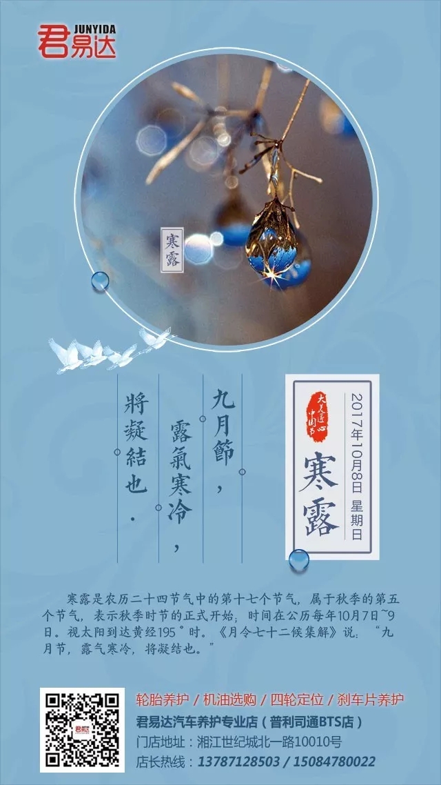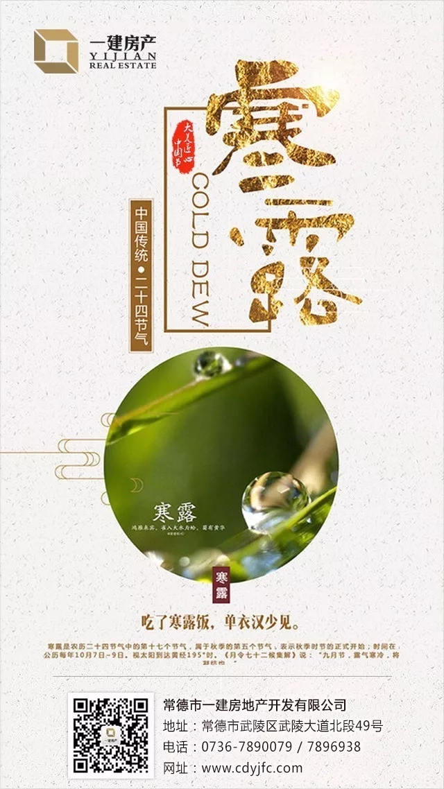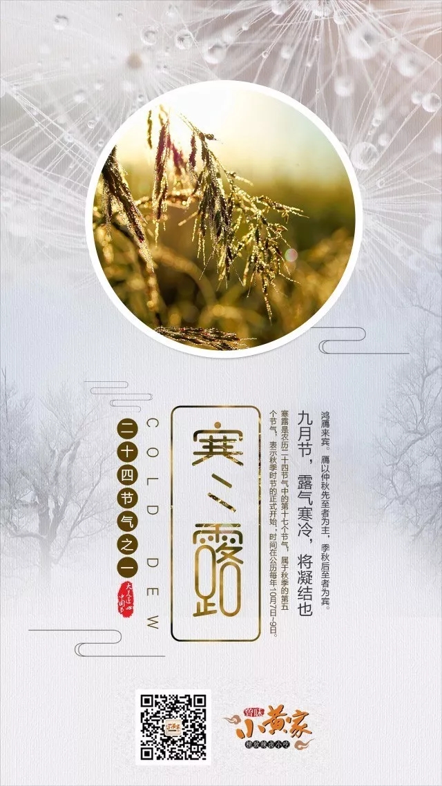 寒露是农历二十四节气中的第十七个节气,属于秋季的第五个节气,表示秋季时节的正式开始;时间在公历每年10月7日~9日。视太阳到达黄经195°时。《月令七十二候集解》说:“九月节,露气寒冷,将凝结也。”寒露的意思是气温比白露时更低,地面的露水更冷,快要凝结成霜了。寒露时节,南岭及以北的广大地区均已进入秋季,东北进入深秋,西北地区已进入或即将进入冬季。